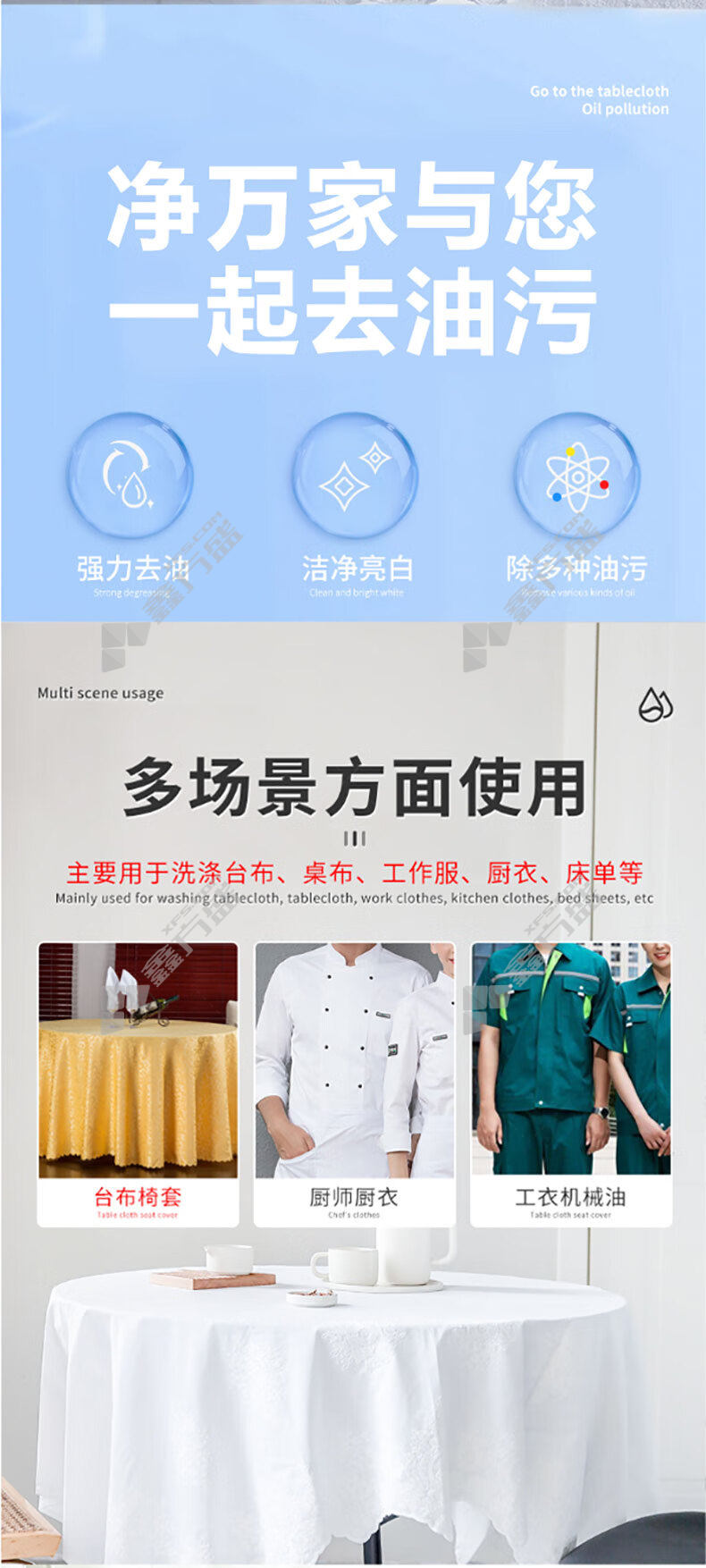 清洗剂适用场景:台布、厨衣、工衣、工厂地板、食品厂