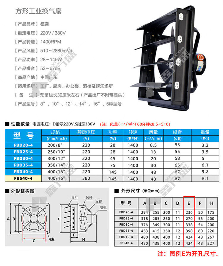 商品名称: 德通 FBD30-4 1200m³/h 窗式 换气扇 45W FBD30-4 300mm