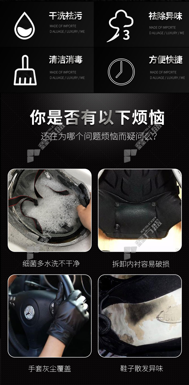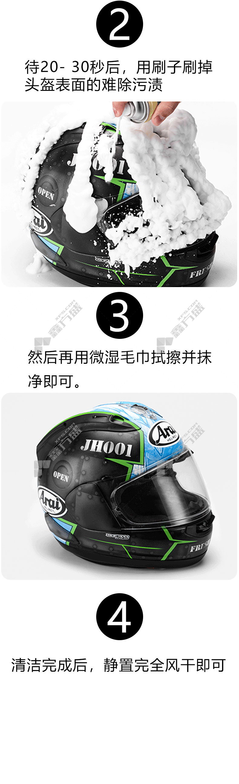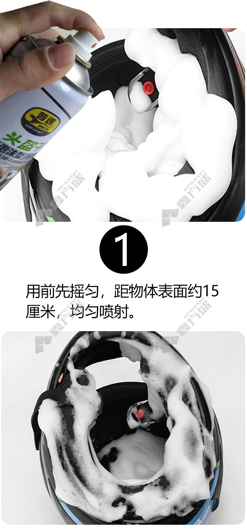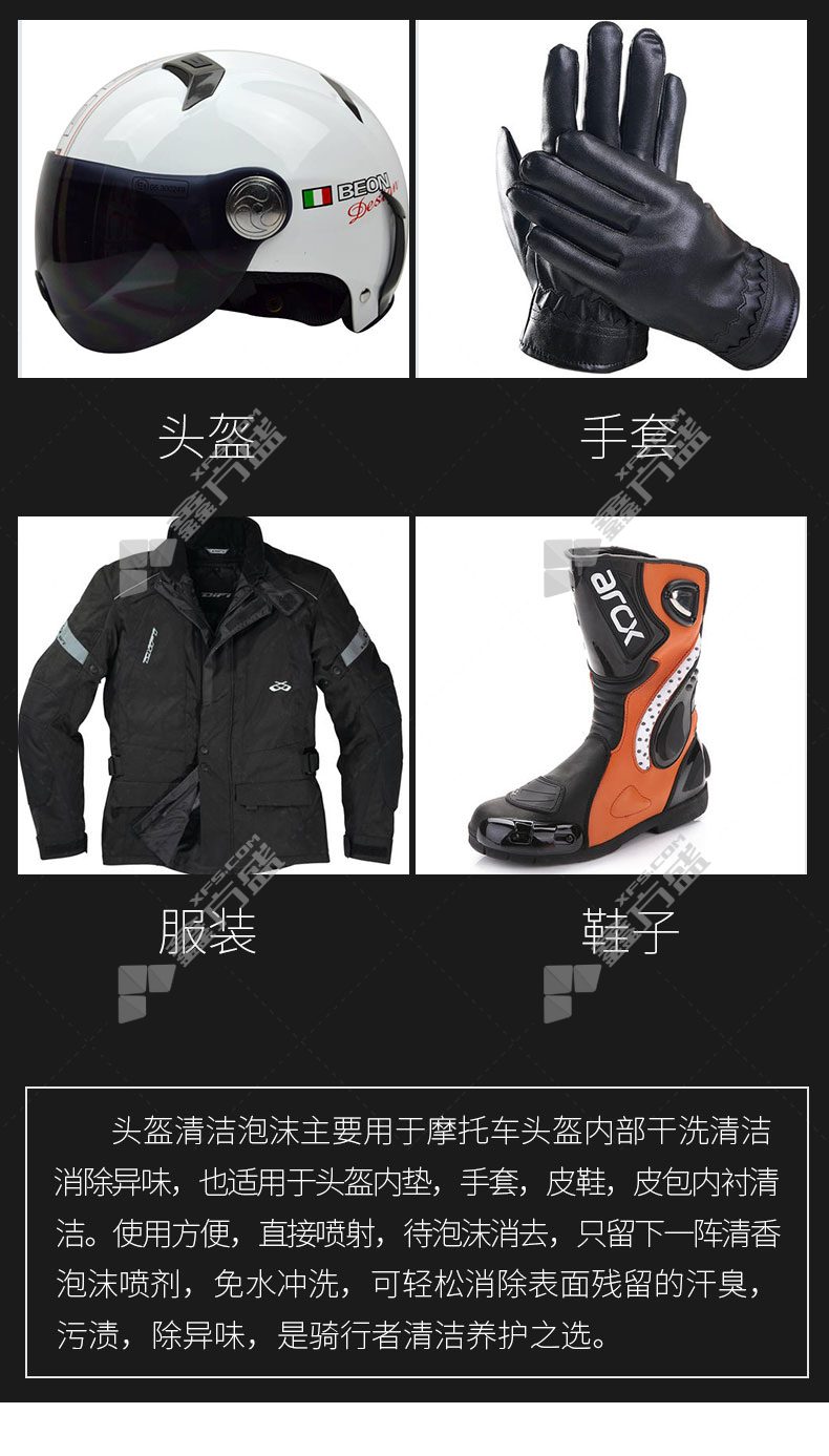 漆面保养剂应用场景:主要用于摩托车头盔内部干洗清洁消除异味,也适用于头盔内垫,手套,皮鞋,皮包内衬清洁。