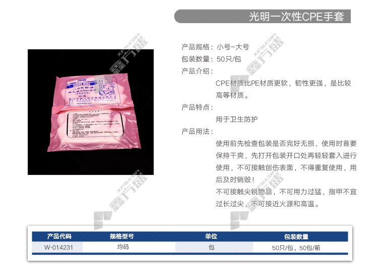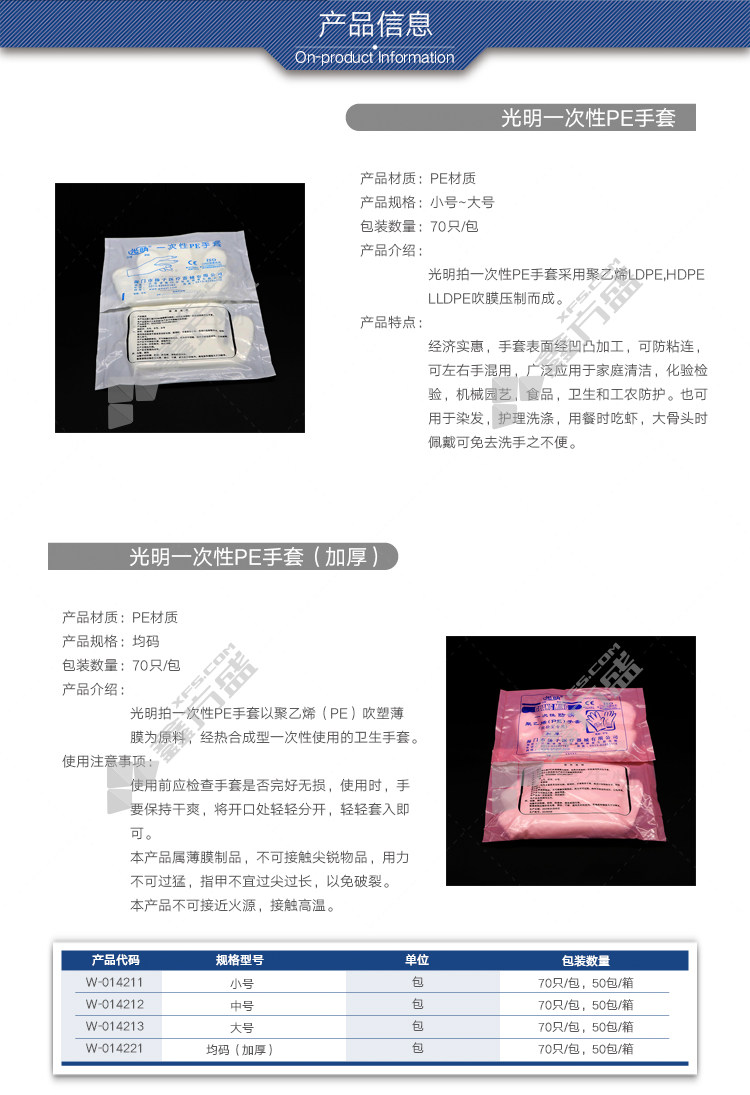 商品名称: 光明 一次性PE手套 均码(加厚)