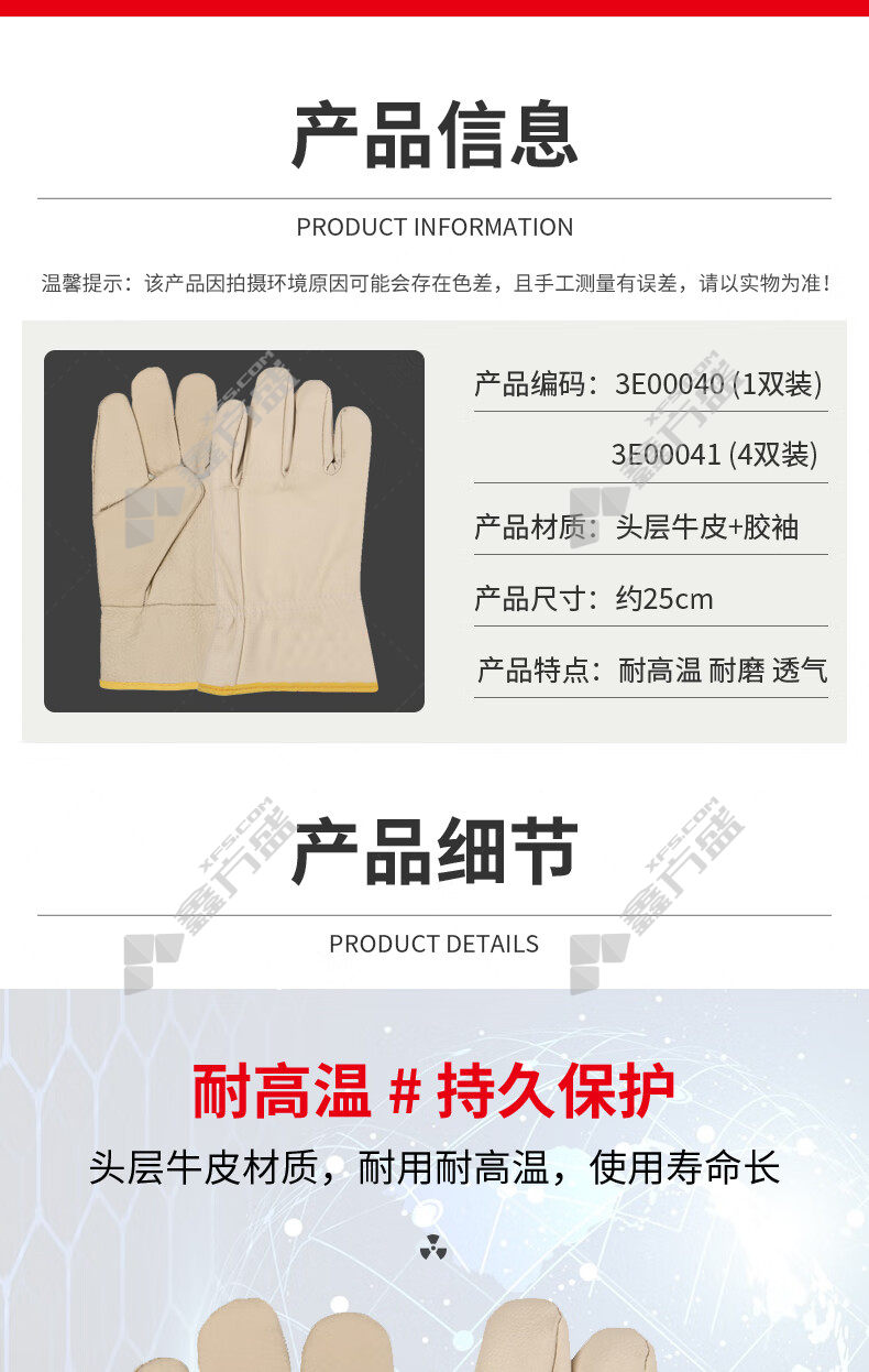商品名称: 安赛瑞 3E00041头层全牛皮电焊手套 3E00041 25cm 浅色