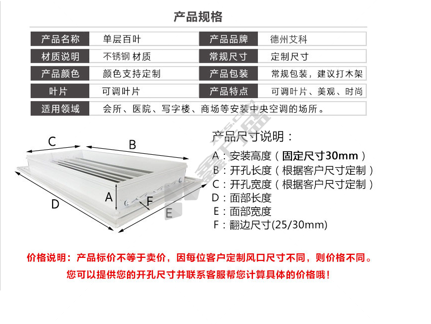 商品名称: #泰昌 泰昌单层百叶风口(定制) 不锈钢,A*B=320*250