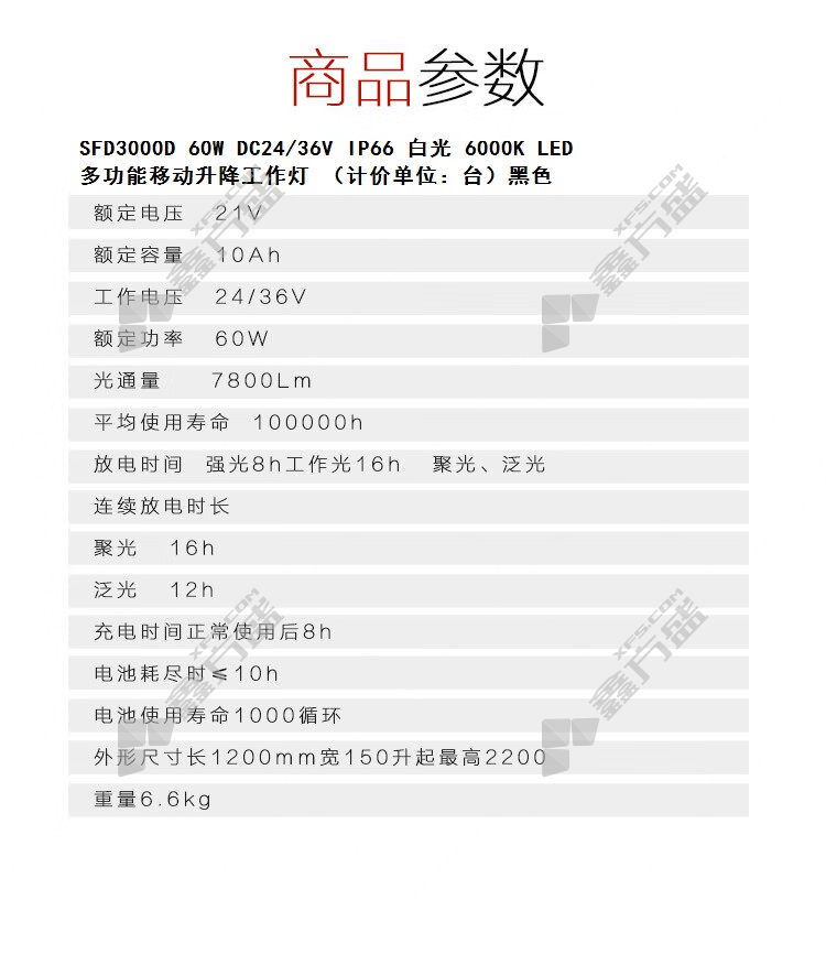 商品名称: 正辉 多功能移动升降工作灯 SFD3000D IP66 18.5V 60W