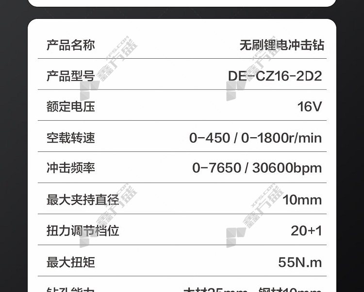 商品名称: 得力工具 16V 55N.m 锂电冲击钻 55N.m:DE-CZ16-2D2 16V 双电一充