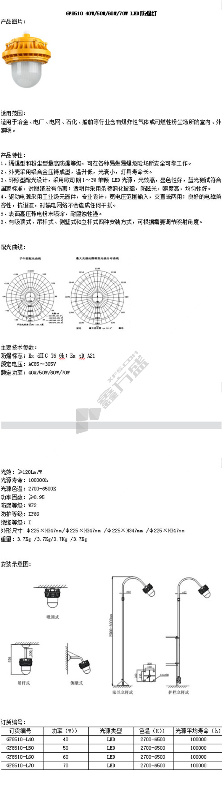源本技术 LED防爆灯. GF8510-70W 70W白光 侧壁安装 含吸盘、0.3米弯杆 GF8510 LED 70W 含吸盘、0.3米弯杆.
