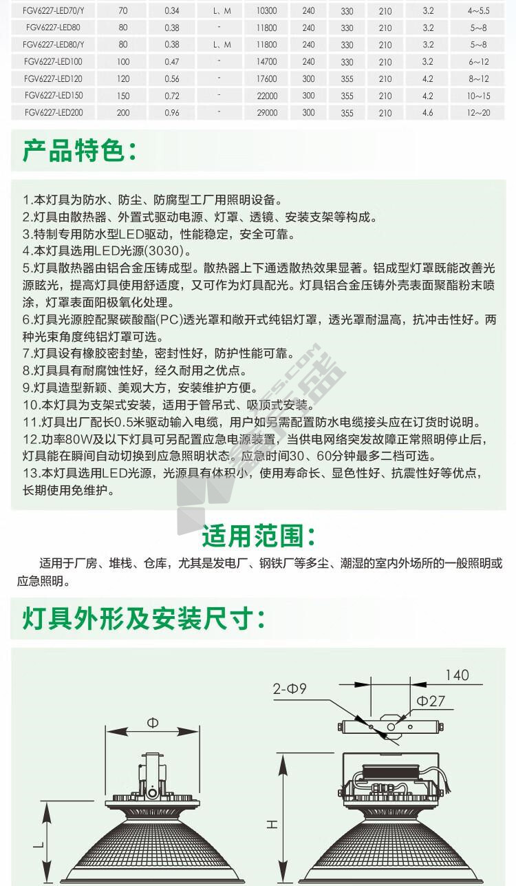 商品规格:FGV6227-LED200 免维护节能 LED 200W IP66 5700K.