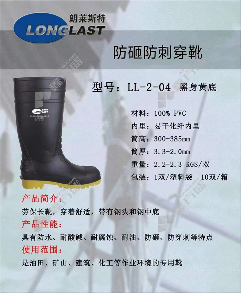 商品名称: 朗莱斯特 耐酸碱耐腐蚀防砸防穿刺特制矿山靴 43码 黑筒黄底 LL-2-04