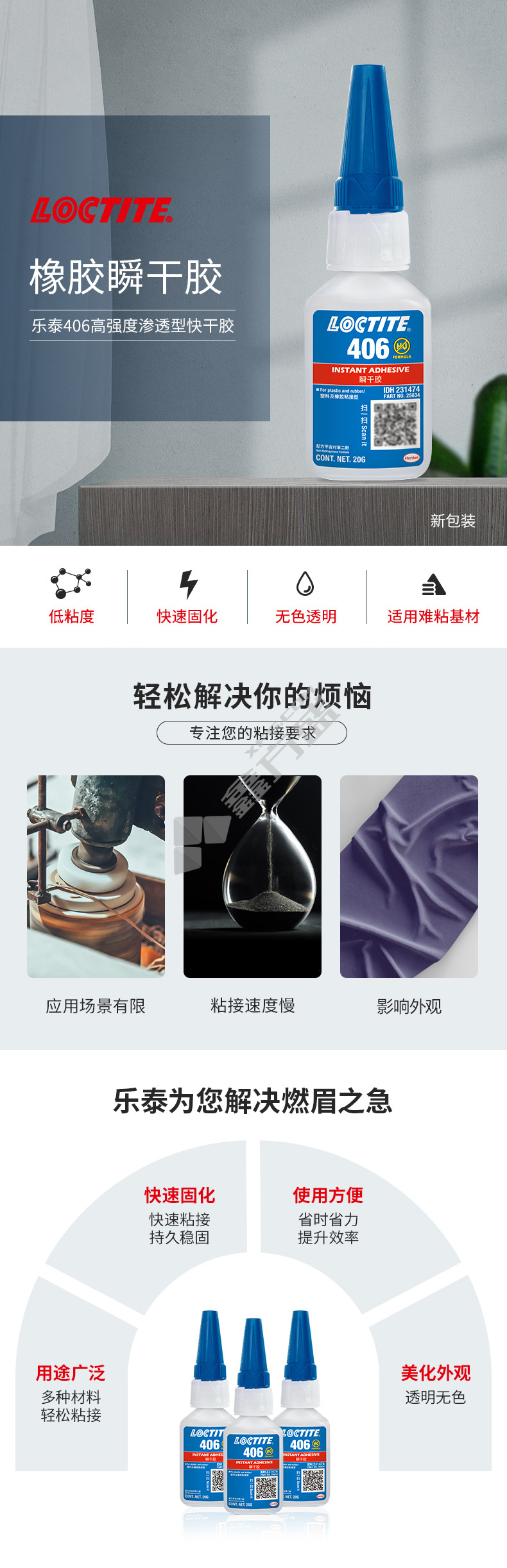 商品规格:Loctite406低粘度塑料橡胶粘结 500g.