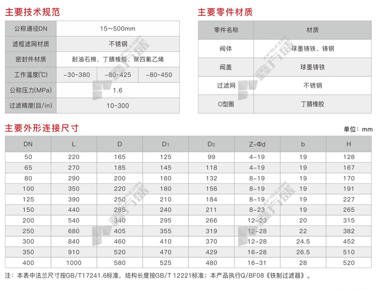 铸钢过滤器密封材质:耐油石棉、丁腈橡胶、聚四氟乙烯