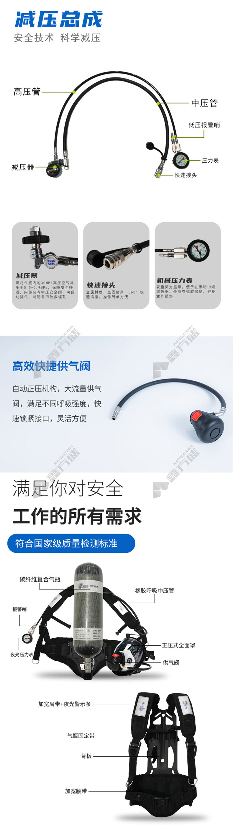自给式空气呼吸器材质:面罩材质:硅胶 气瓶材质:碳纤维复合气瓶