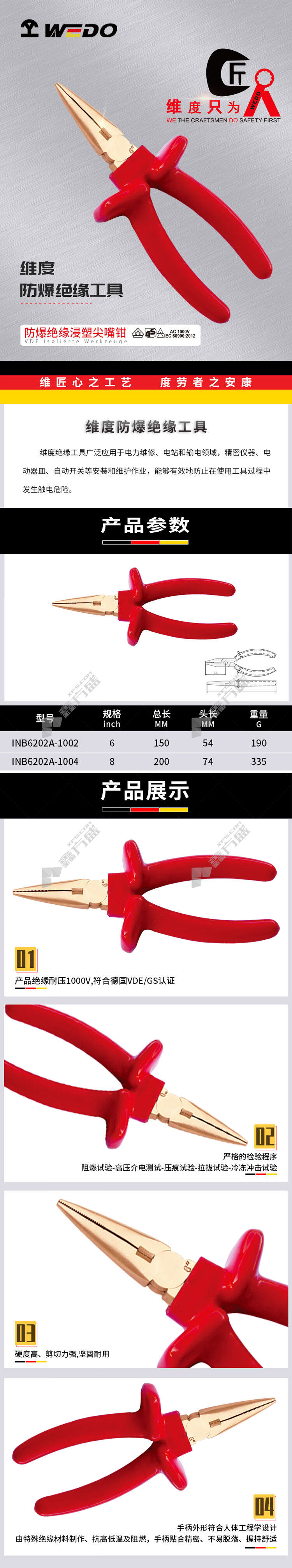 商品名称: 维度 防爆绝缘浸塑尖嘴钳 铍青铜 INB6202A-1002 6'' 150mm