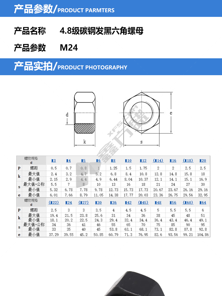 商品名称: 千鉴思 六角螺母 M24 4.8级碳钢发黑,4个/包.