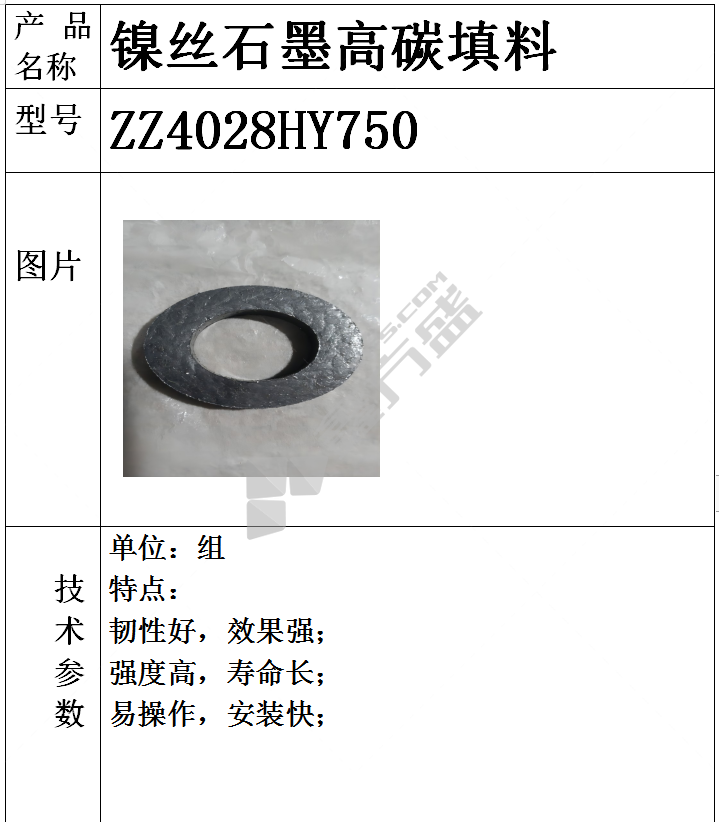 商品名称: 福州核威 镍丝石墨高碳填料. ZZ4028HY750 预烧丝镍网加抗氧化石墨加高碳,耐高温750℃,耐高压36.2MPa.