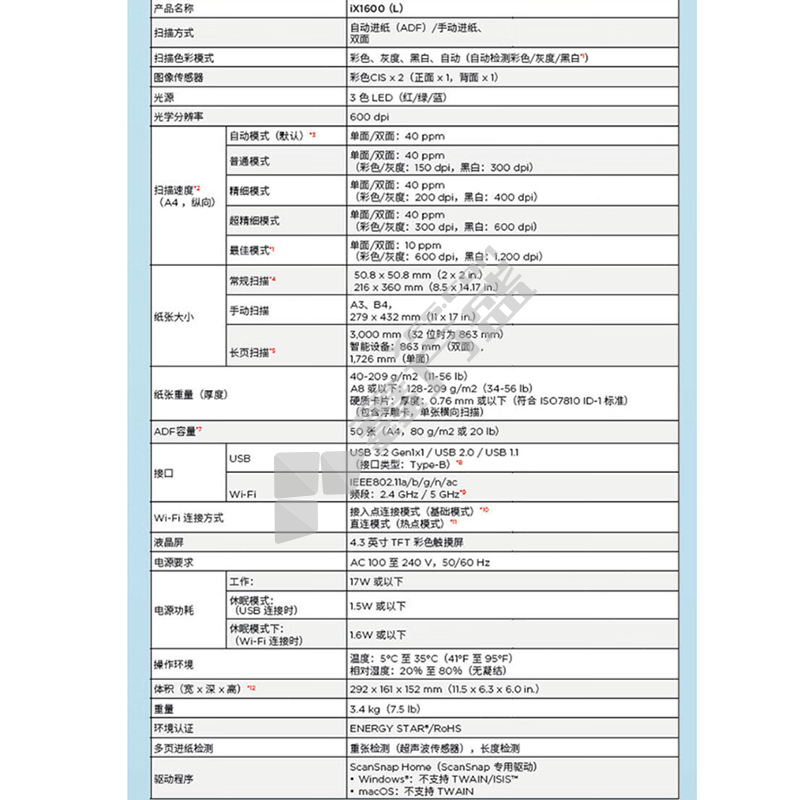 商品名称: ix1600扫描仪 A4双面馈纸式 (40页/分钟+4.3英寸触摸屏+无线WiFi)
