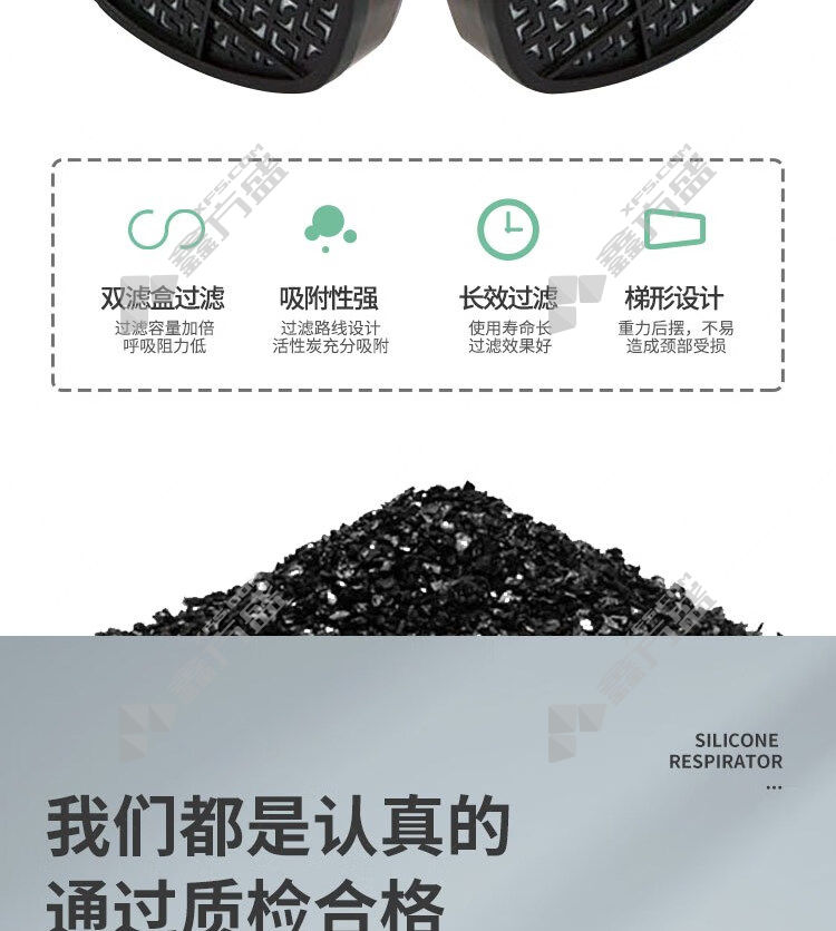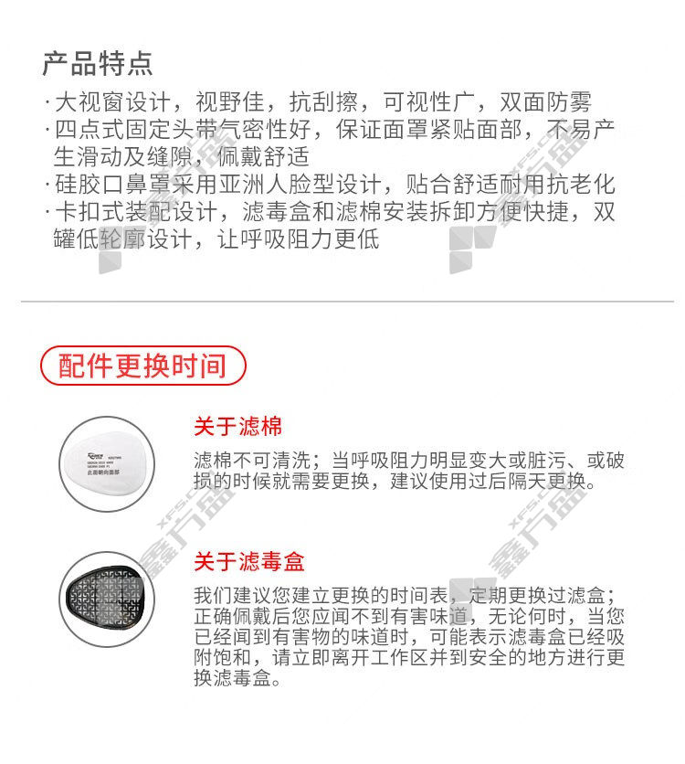包装清单:全面罩*1个、防有机滤毒盒*1个、预过滤棉*1个、预过滤棉盖*1个
