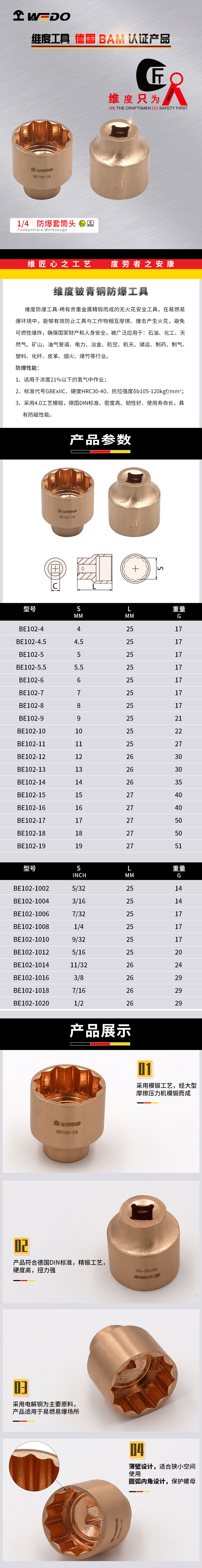 首页 首页 > 维度 铍青铜 1/4"公制防爆套筒头 7mm 25mm BE102-7