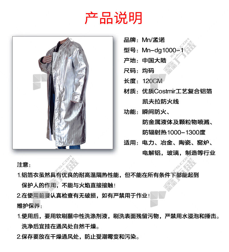 商品名称: MN/孟诺 Mn-dg1000-1 1000度铝箔耐高温大衣 均码 银色 Mn-dg1000-1
