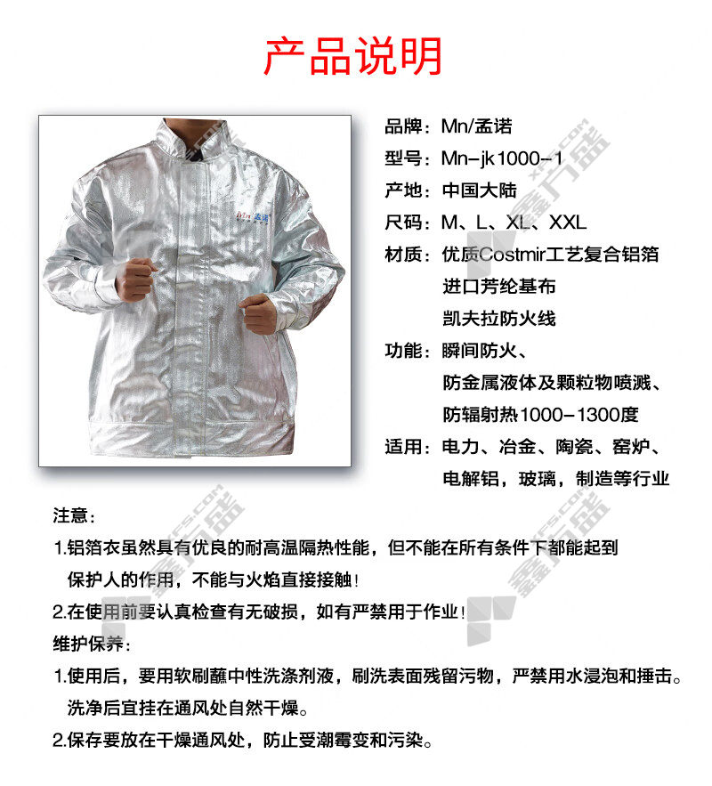商品名称: MN/孟诺 Mn-jk1000 1000度铝箔隔热夹克 均码 银色 Mn-jk1000