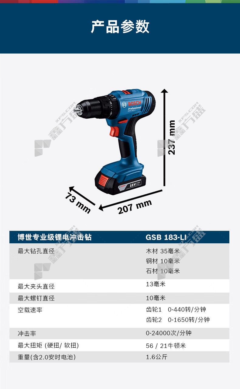 商品名称: 博世 GSB 183-LI 2B 锂电充电式冲击钻 GSB 183-LI 2B 18V锂电 24000次/分钟