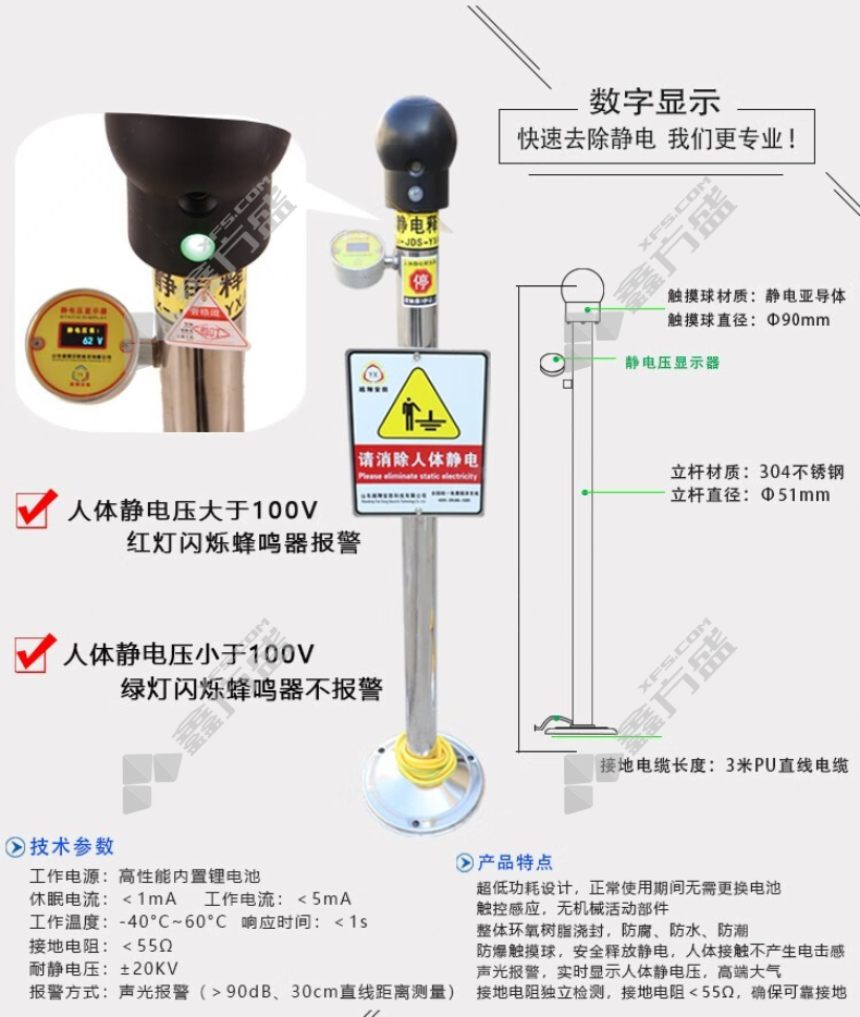 商品名称: 越翔安防 EX-JDS-YXA 人体静电释放器 立柱直径51mm 底座直径210mm 整体高度1.1m 黄黑 防爆声光报警款
