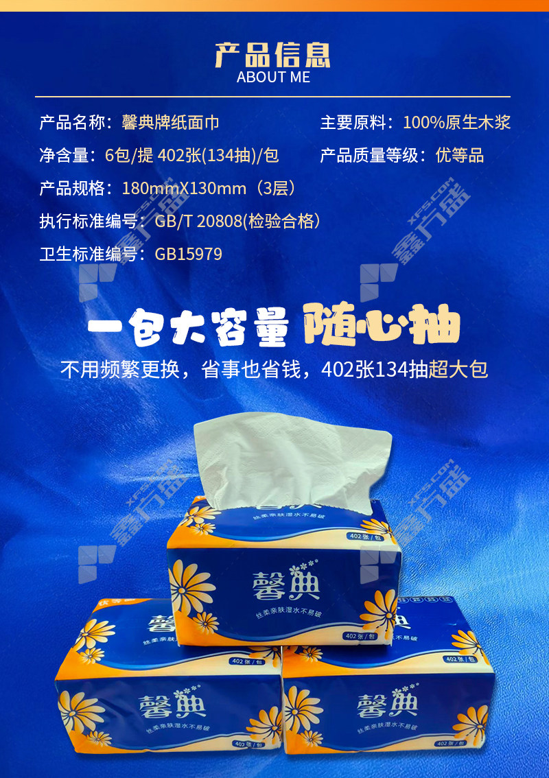 商品名称: 馨典 XD-2239 超韧软抽纸巾 3层 134抽 134抽/包 6包/提 XD-6026 130*180mm 130g