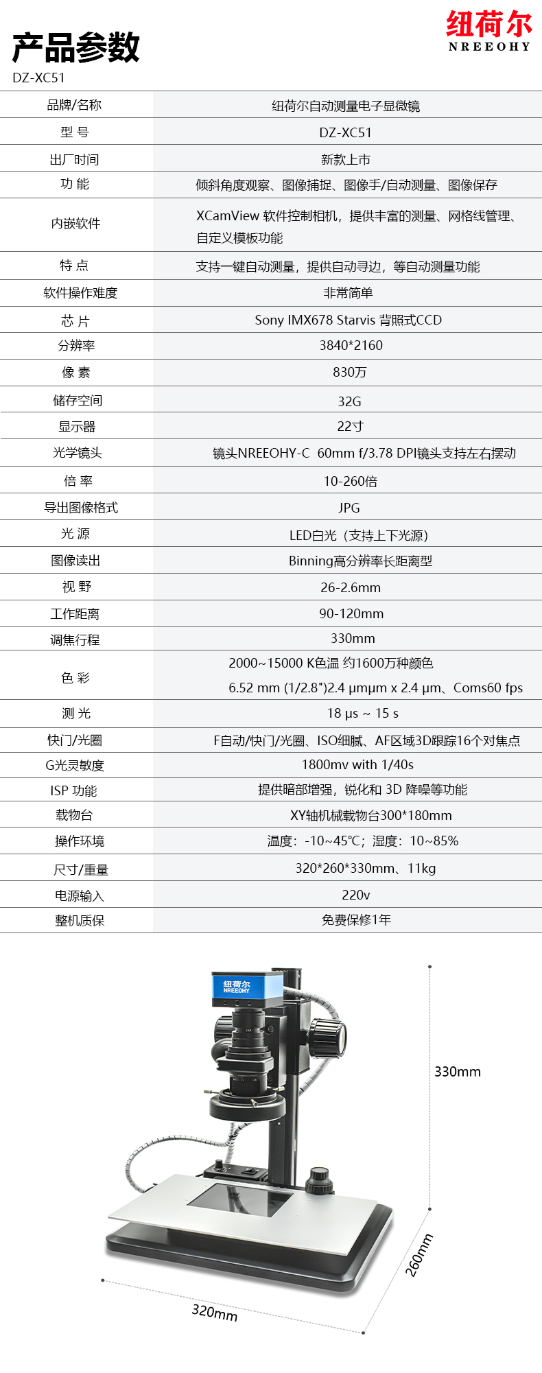商品名称: 纽荷尔 自动测量电子显微镜 10-260倍 DZ-XC51