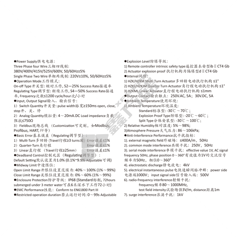 电动执行机构. EGMF300 输入信号:模拟量信号4-20mA输出信号:阀位反馈信号:4-20mA.DC负载阻抗≤750Ω输出轴力矩:3000Nm死区:0.1~9.9%可调默认设置为≤0.5%中途限位开限位设置范.