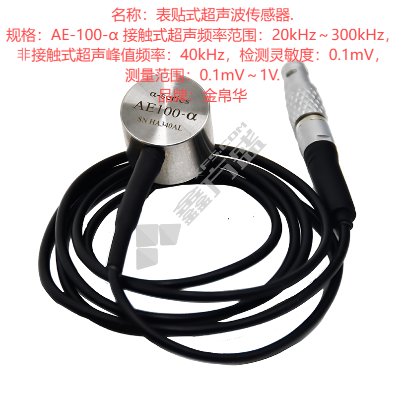 表贴式超声波传感器. AE-100-α  接触式超声频率范围:20kHz~300kHz,⾮接触式超声峰值频率:40kHz,检测灵敏度:0.1mV,测量范围:0.1mV~1V.