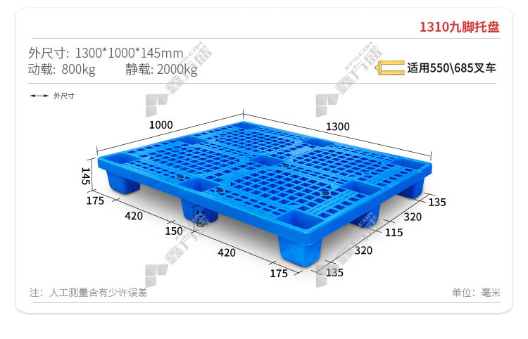 商品名称: 赢宙 九角 托盘 1008 1000*800*140mm 1500kg 500kg 蓝色 无钢管 加厚款