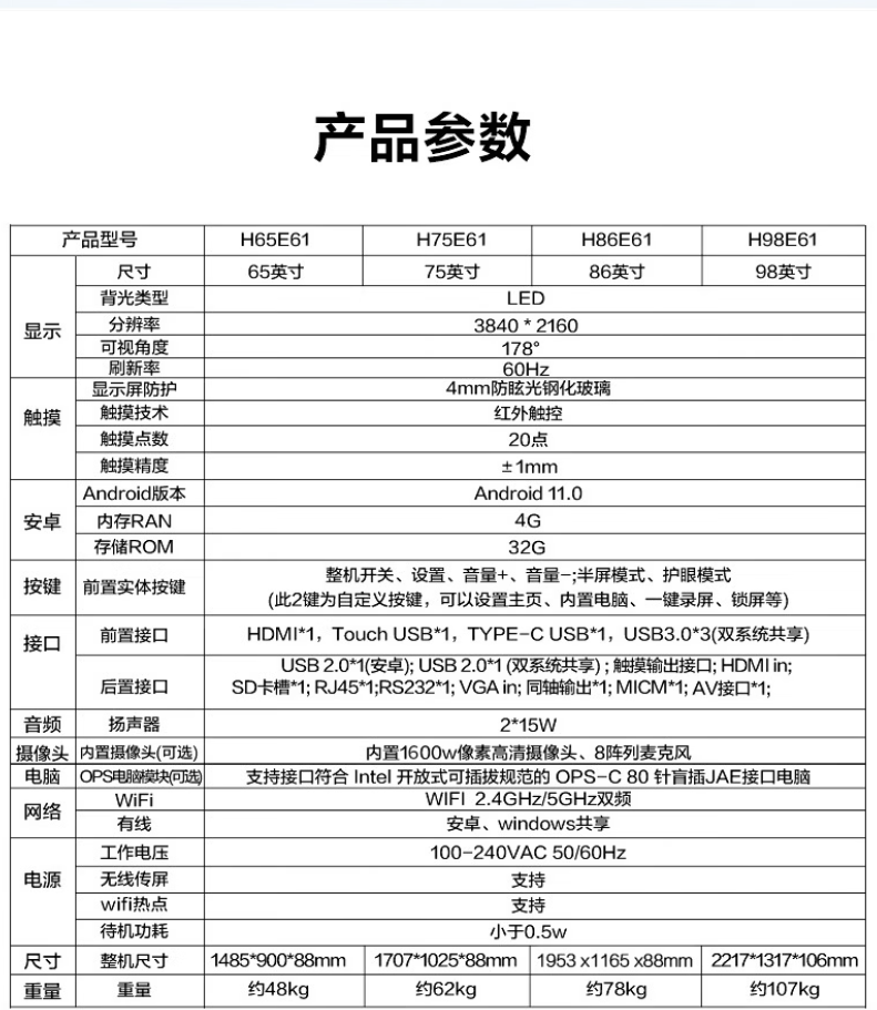 包装清单:触控一体机*1台、说明书*1件、电源线*1根、书写笔*1根、壁挂套装*1套