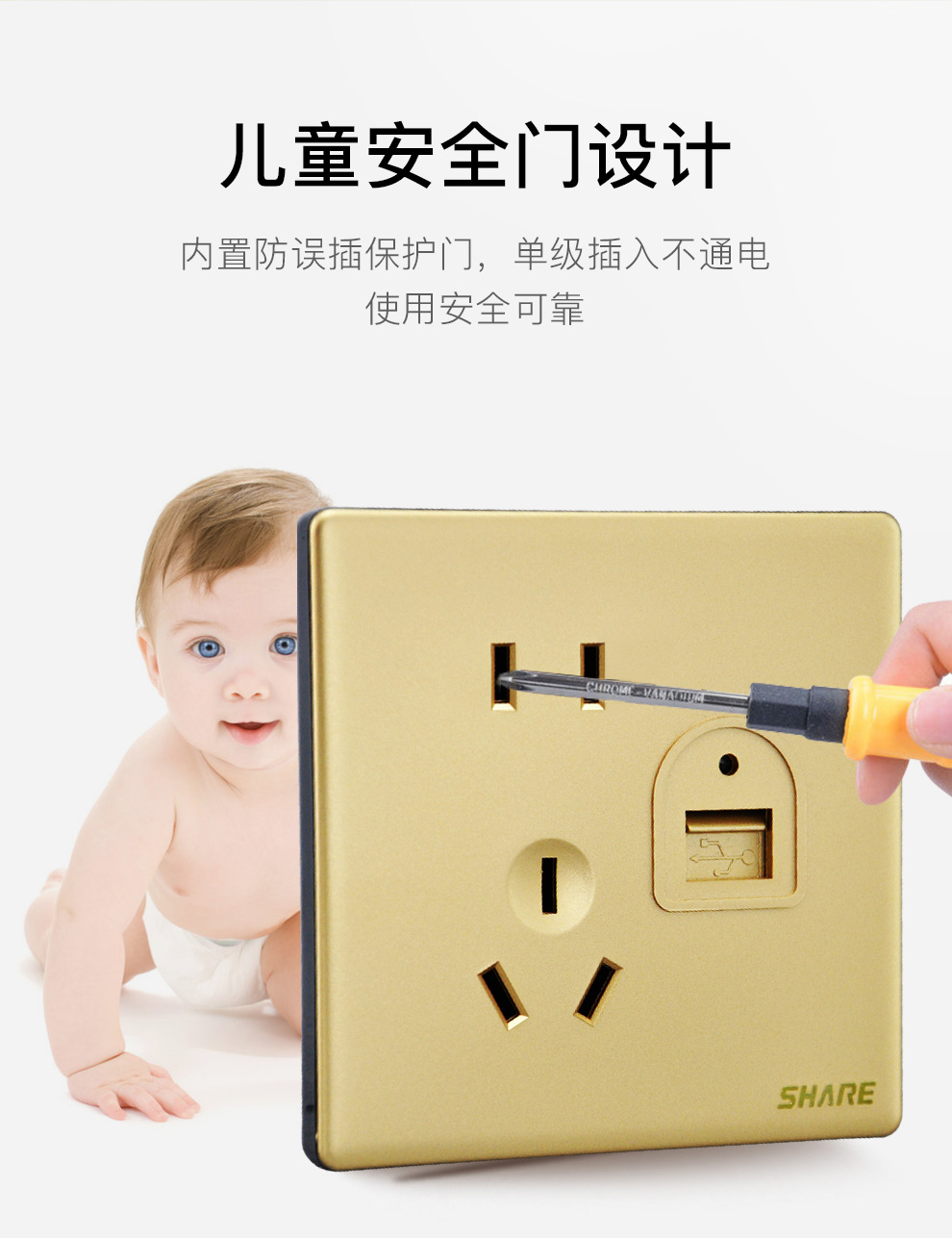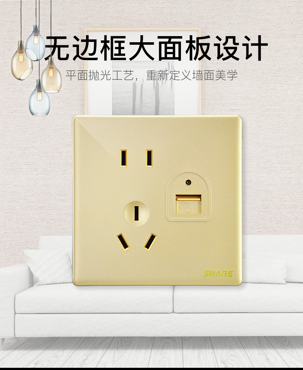 • 西野 三孔 有保护门 梦彩香槟金双控一开插座 86型 金色 10A 16A 220V