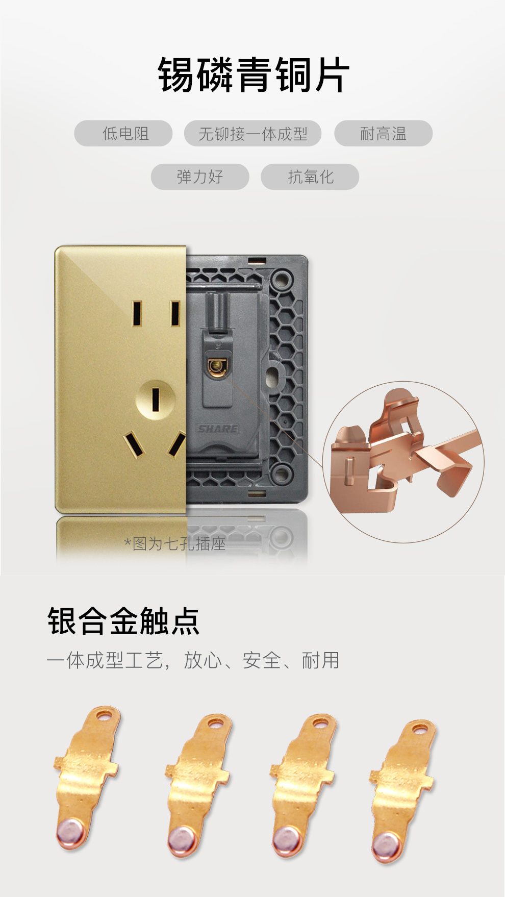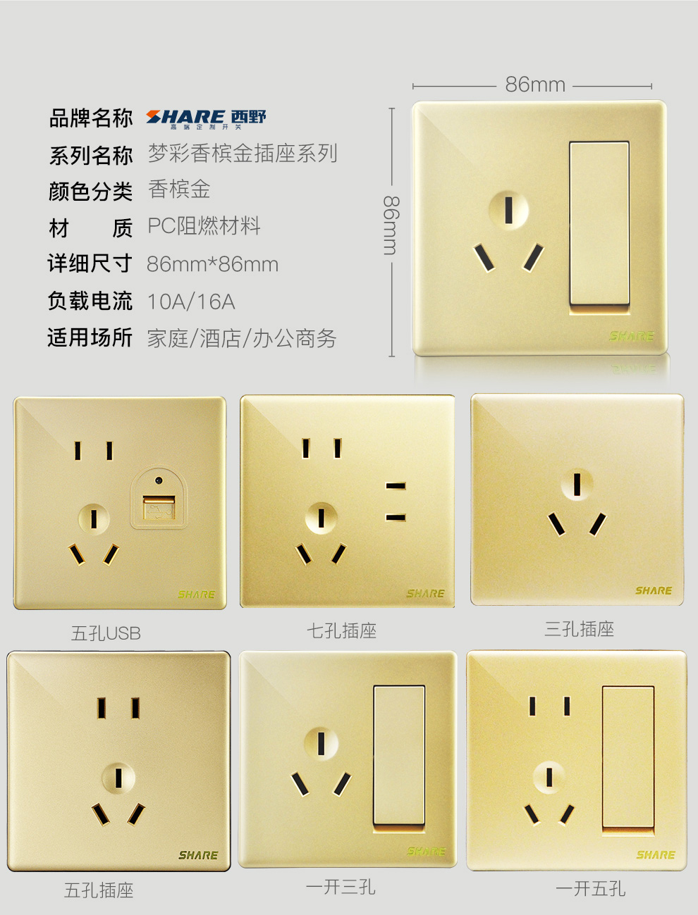 商品名称: 西野 三孔 有保护门 梦彩香槟金双控一开插座 86型 金色 10A 16A 220V