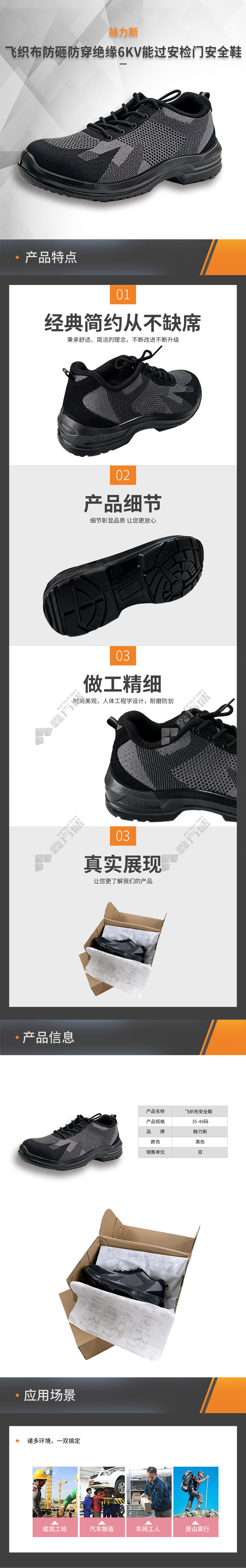 商品名称: 赫力斯 飞织布防砸防穿绝缘6KV能过安检门安全鞋 43码 黑色