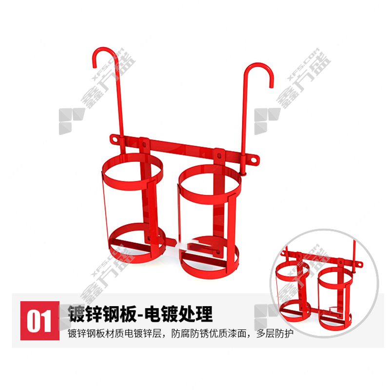 商品名称: 红色挂壁式铁质加厚灭火器双挂架 2kg*2