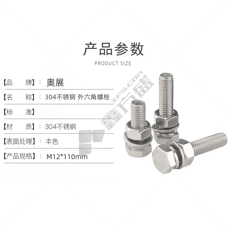 商品名称: 奥展 GB5782 304不锈钢 半牙外六角螺栓含1母1薄母2平垫 M12*110mm
