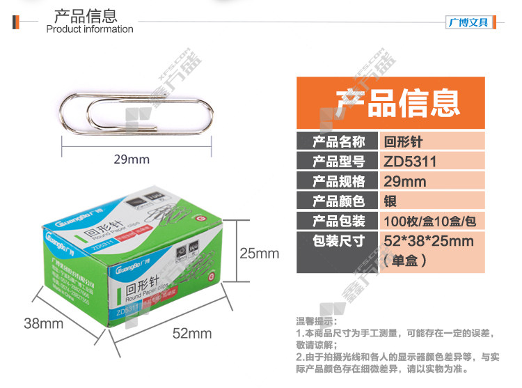 商品名称: 广博 ZD5311 回形针 29mm 银色 100枚