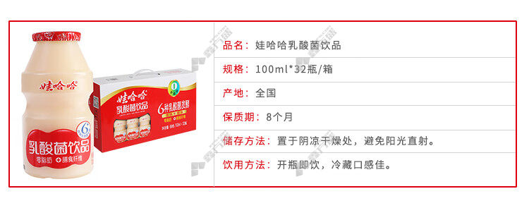 商品规格:乳酸菌饮品益生菌牛奶、100ml*32瓶、32瓶/箱