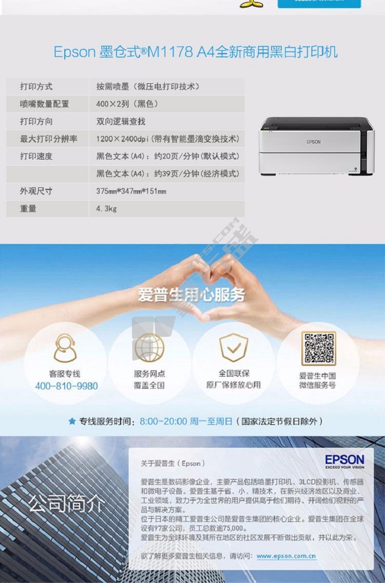 商品名称: 爱普生 喷墨打印机. M1178 A4幅面墨仓式黑白打印机打印速度:39页 分钟 经济模式 20页 分钟 标准模式.