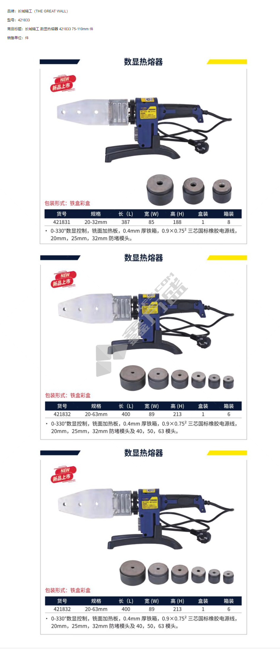 商品名称: 长城精工 数显热熔器. 421833 75-110mm