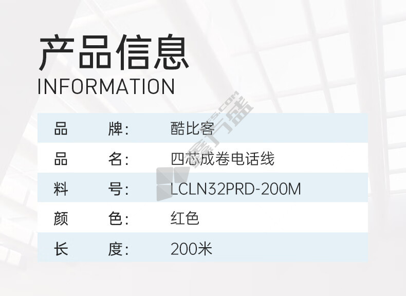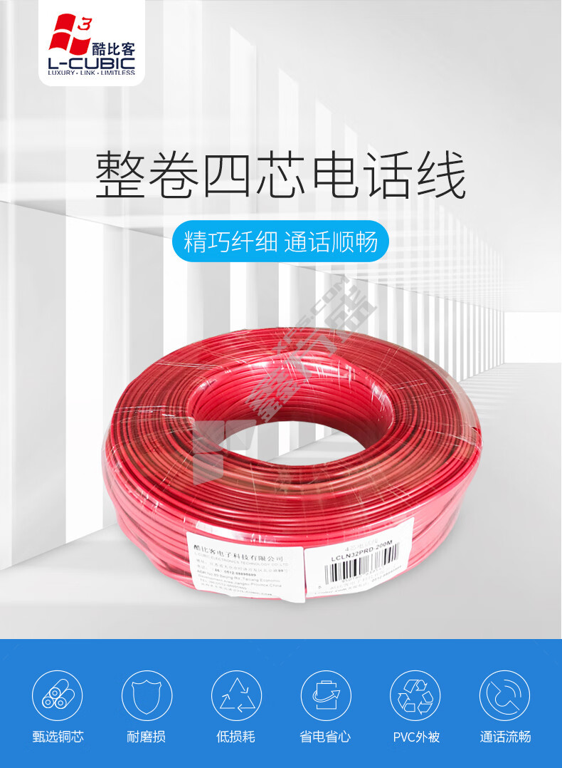 商品名称: 酷比客 电话线. LCLN32PRD-200M 200m 4芯纯铜 RJ11 红色 红色 .