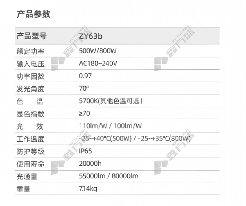 商品规格:ZY63b/800W/5700K/220V/IP66