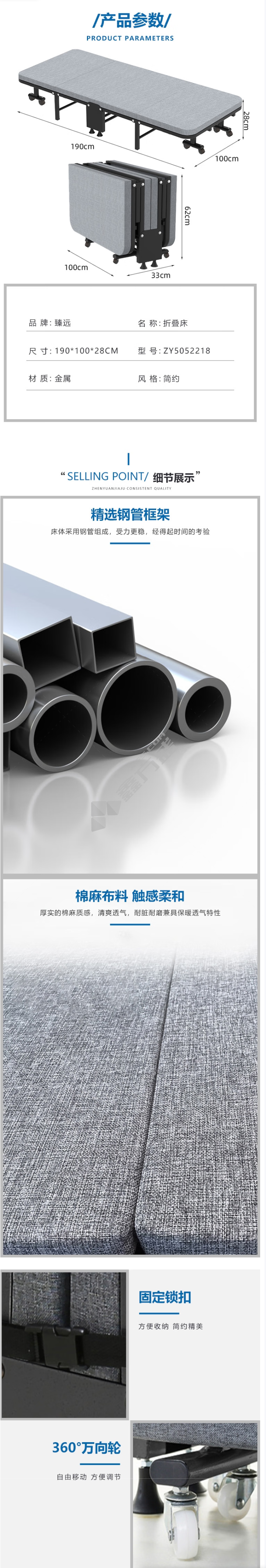 商品名称: 臻远 午休折叠床 ZY5052218 午休折叠床 四折 椰棕垫 190*100*28cm(单位:张)灰色