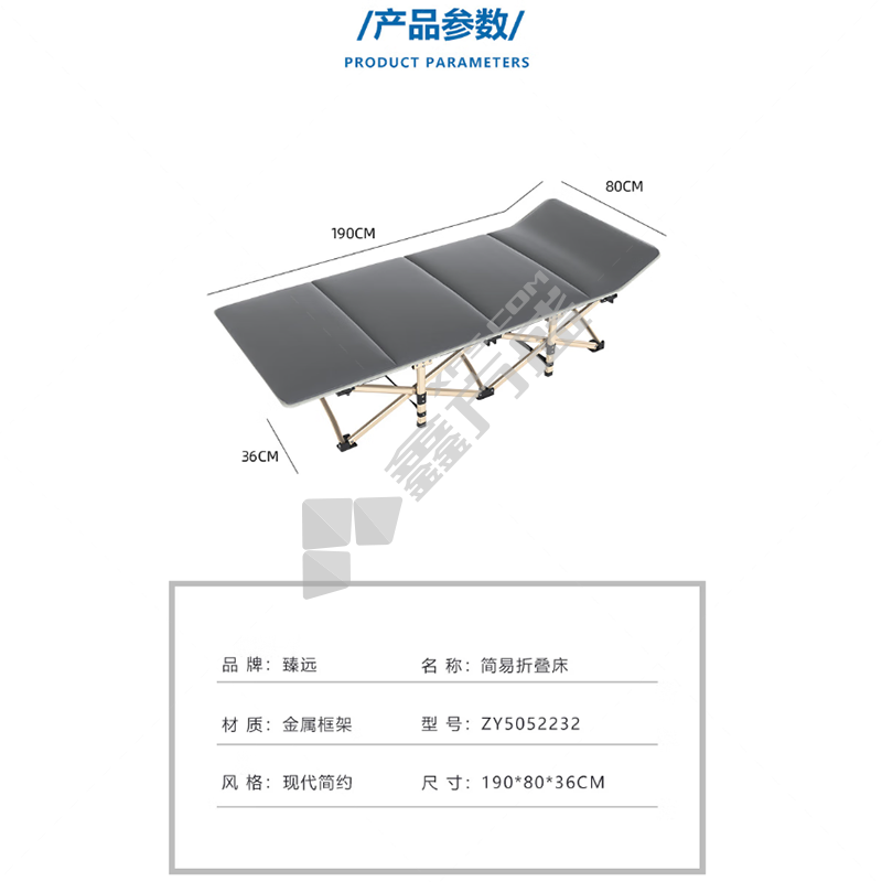 商品名称: 臻远 简易折叠床 灰色方管 ZY5052232 简易折叠床 灰色方管 190*80*36cm(单位:张)深灰色