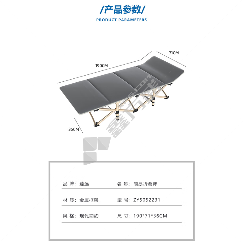商品名称: 臻远 简易折叠床 灰色方管 ZY5052231 简易折叠床 灰色方管 190*71*36cm(单位:张)深灰色