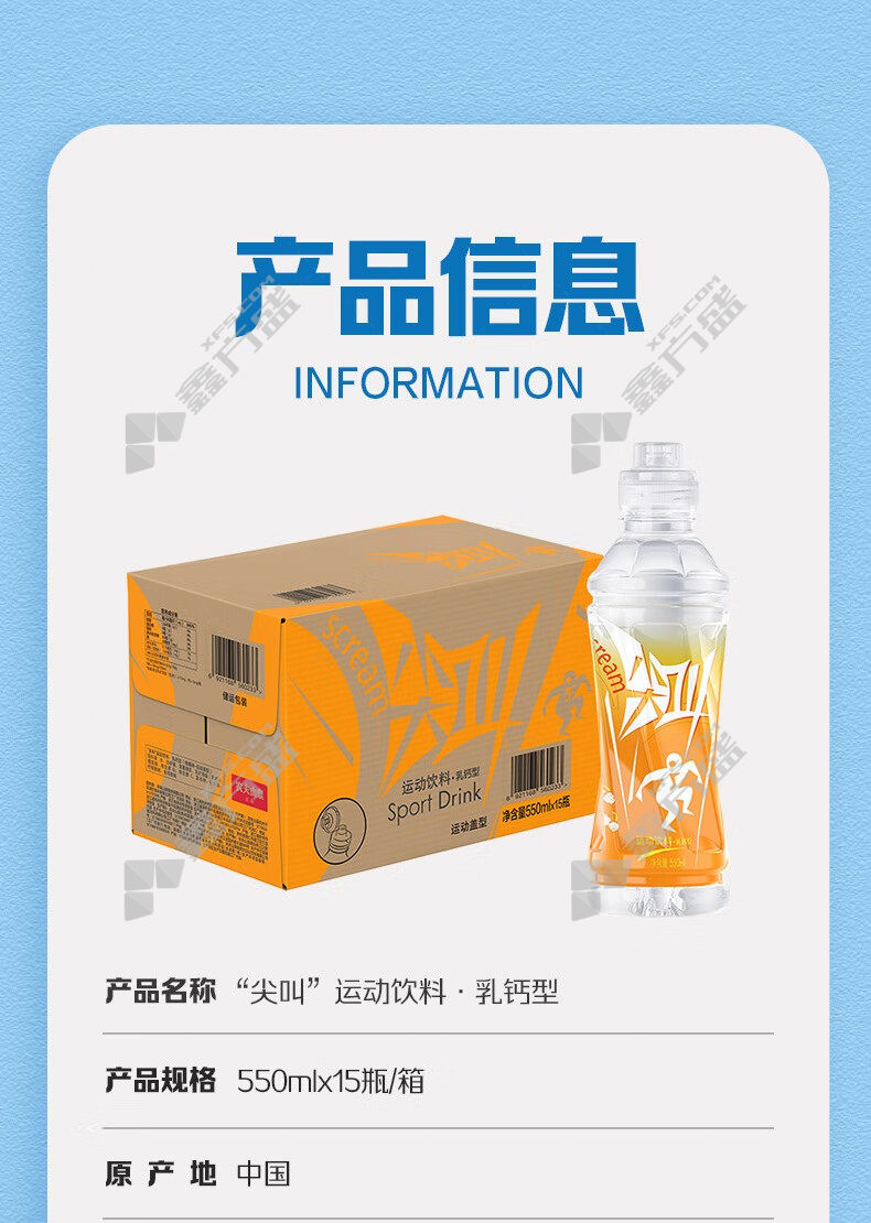 商品名称: 农夫山泉 尖叫乳钙型运动饮料 550ml 柑橘味 15瓶/箱