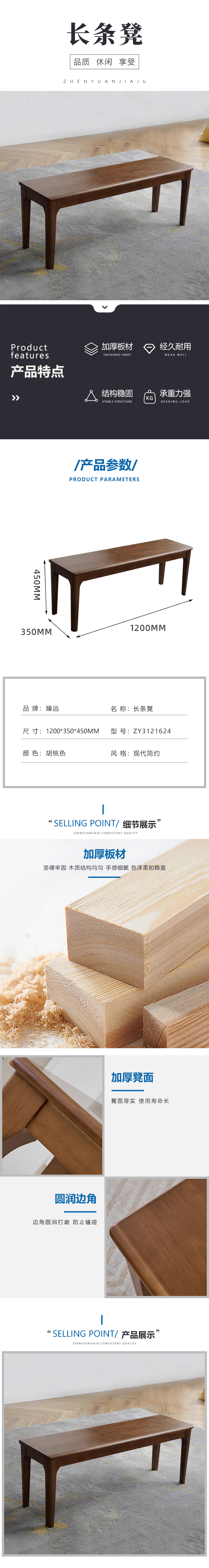 臻远 ZY3121624 全实木长条餐桌凳 1200*350*450mm 胡桃色