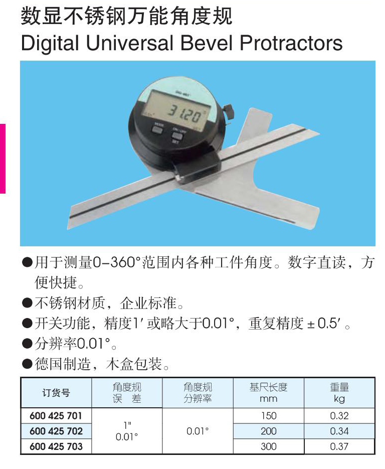 商品名称: 巴可Baco 数显不锈钢万能角度规 600425701-L150mm