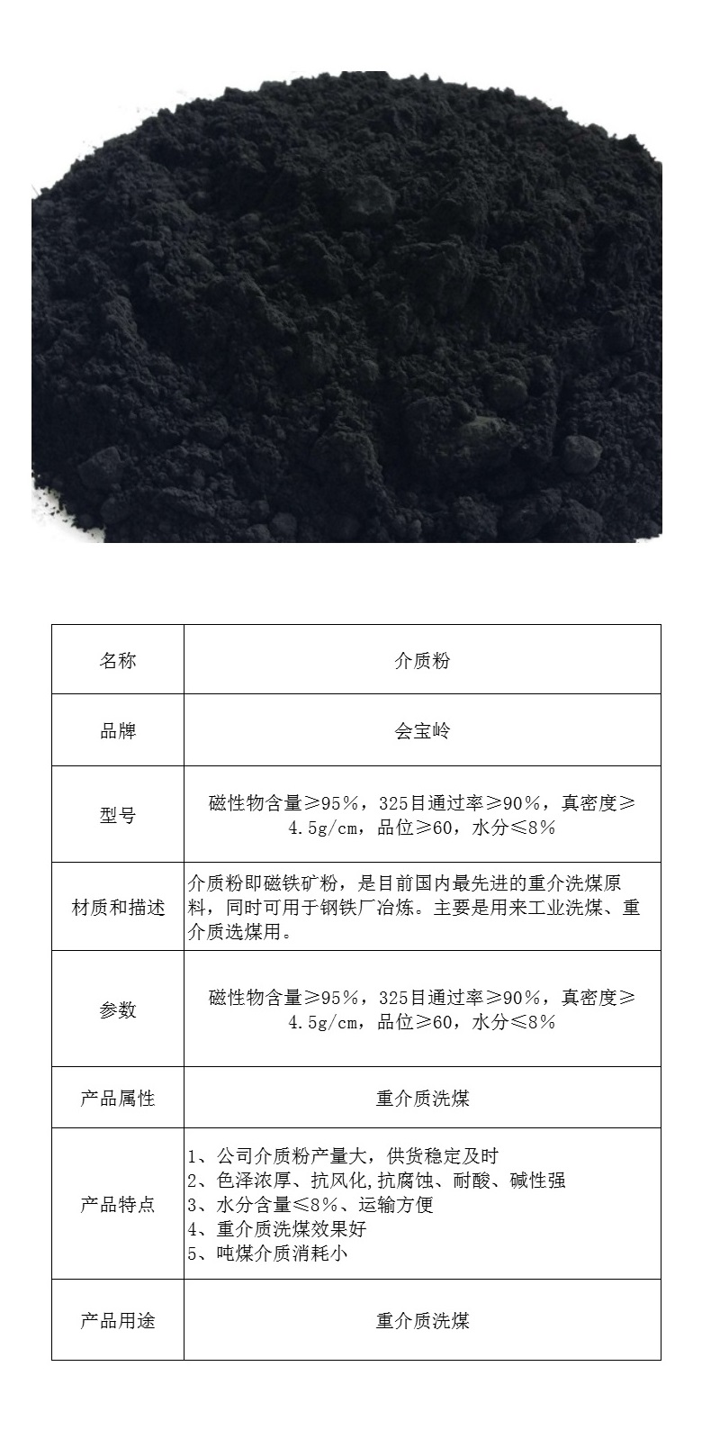 磁性物含量≥95%,325目通过率≥90%,真密度≥4.5g/cm,品位≥60,水分≤8%