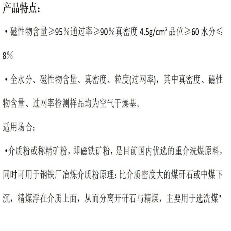 磁性物含量≥95%通过率≥90%真密度4.5g/cm³品位≥60水分≤8%