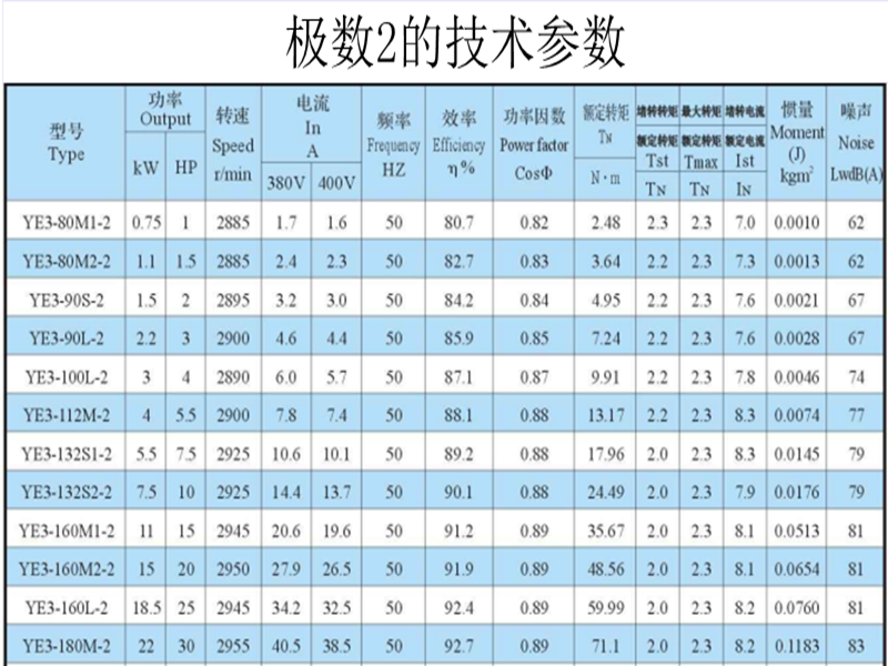 YE3系列超高效三相异步电动机极数为2的技术参数如图所示